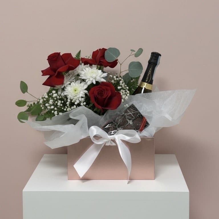 This Valentine’s Gift Box is a Favourite at Everbloom! Includes Champagne, Chocolates and a Floral Arrangement!